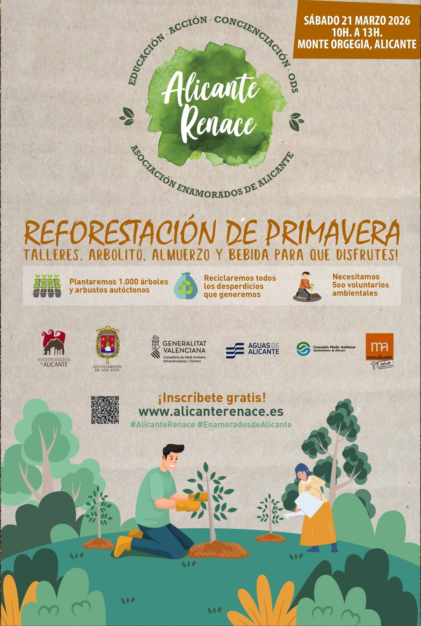 La Concejalía de Medio Ambiente y la Asociación ‘Enamorados de Alicante’ han dado a conocer la Reforestación de Primavera 2026, enmarcada en el proyecto ‘Alicante Renace’. La iniciativa tendrá lugar el sábado 21 de marzo y prevé reunir a más de un millar de voluntarios comprometidos con la recuperación y mejora del entorno natural